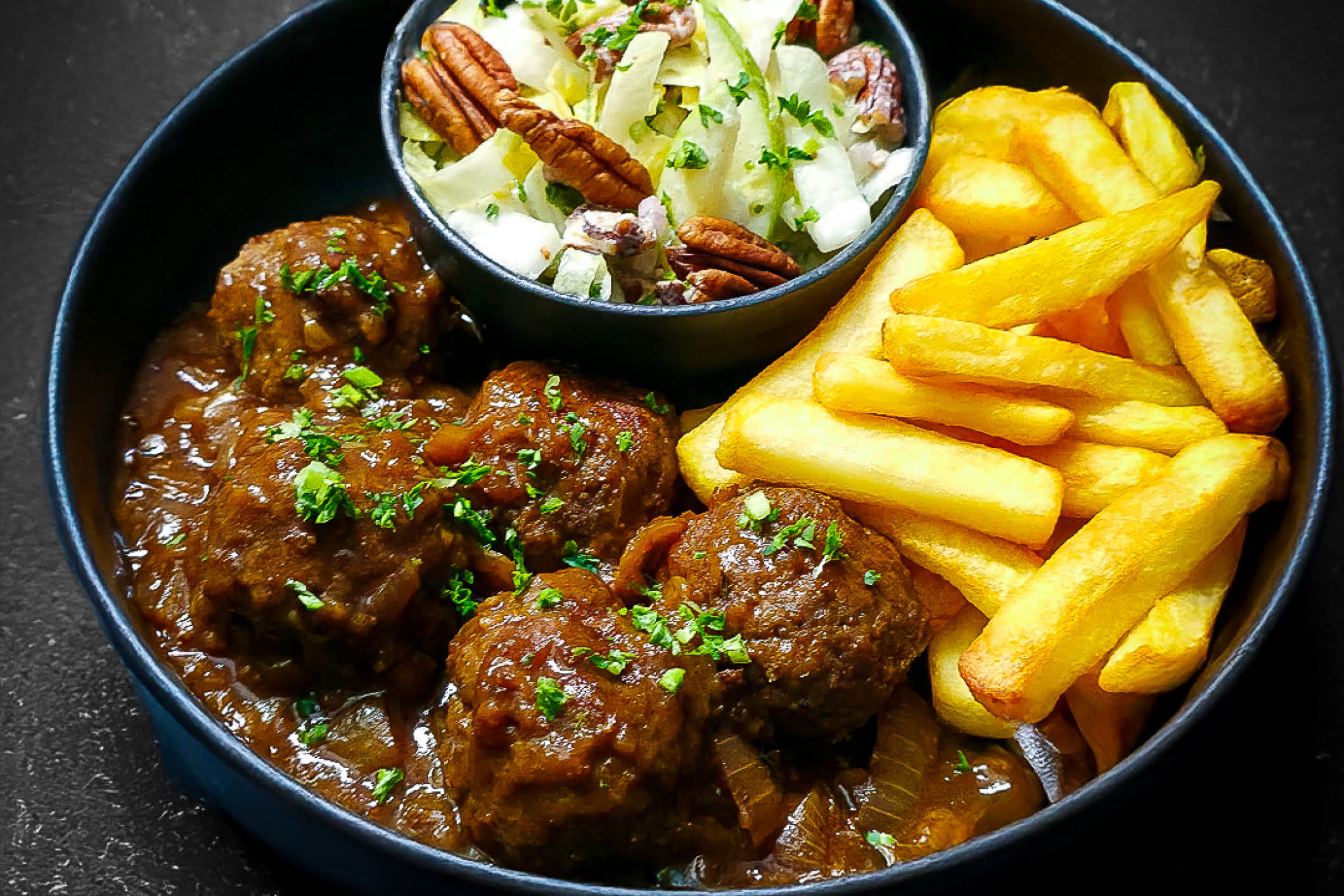 Stoofpotje van hert met peperkoek, witloof, butternut en gebakken krielaardappelen