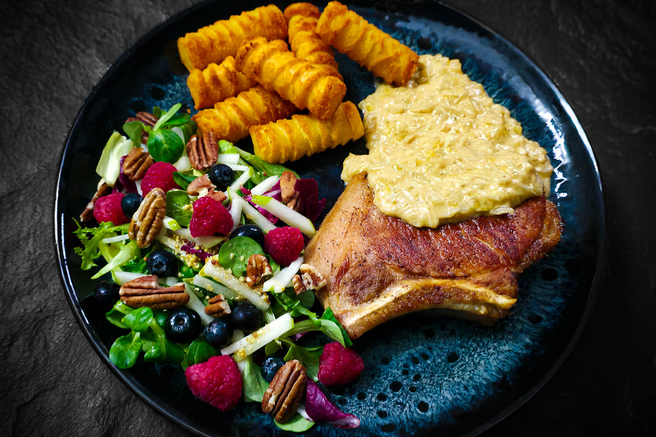 Varkenskotelet blackwell met gebakken bloemkool en gekookte aardappelen